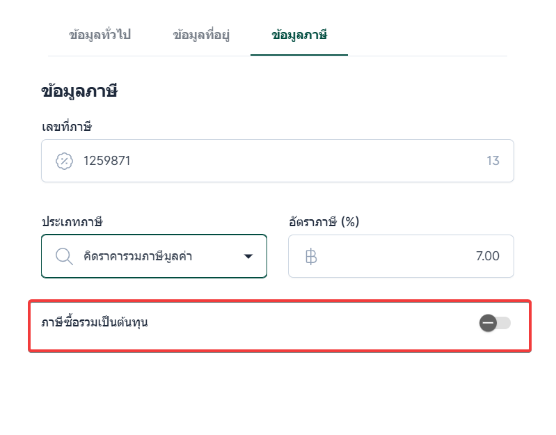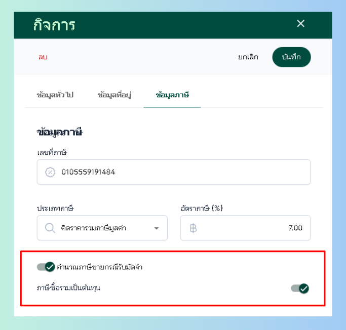 ภาษีซื้อรวมเป็นต้นทุน เมื่อผู้ใช้งานสั่งสินค้ามาส่วนนี้จะมีการคำนวนว่าต้องรวมภาษีซื้อเป็นต้นทุนหรือไม่สามารถเปิด-ปิดการใช้งานส่วนนี้ได้