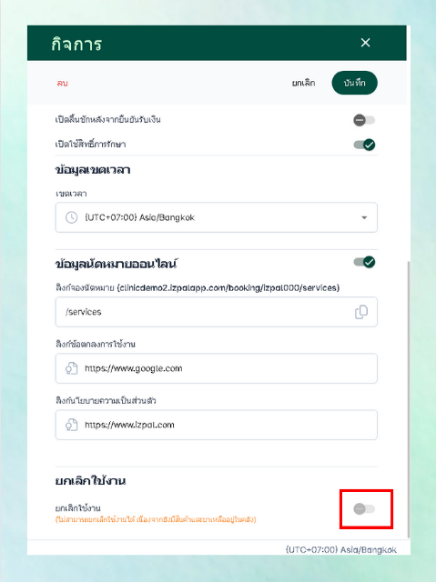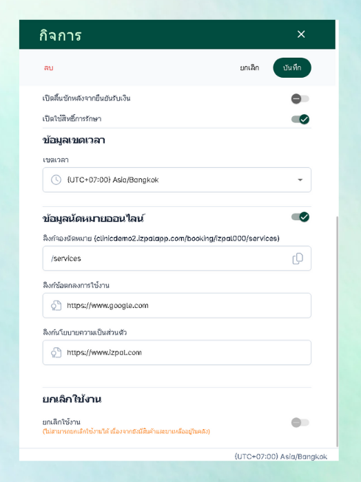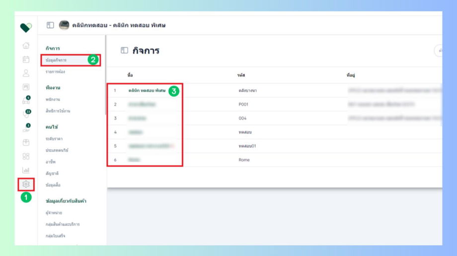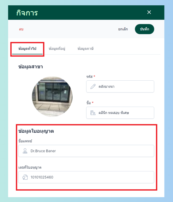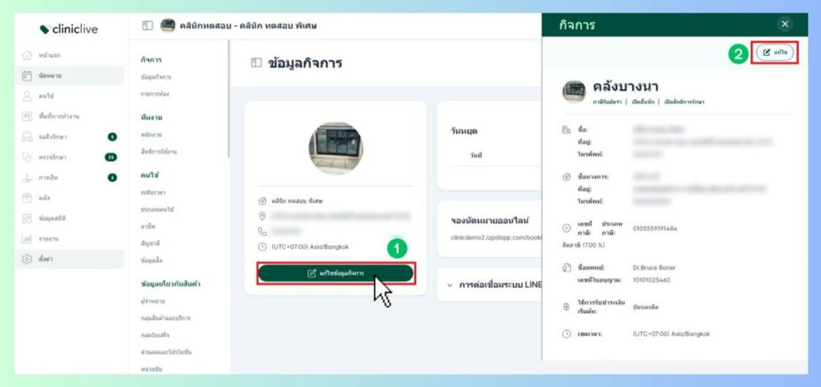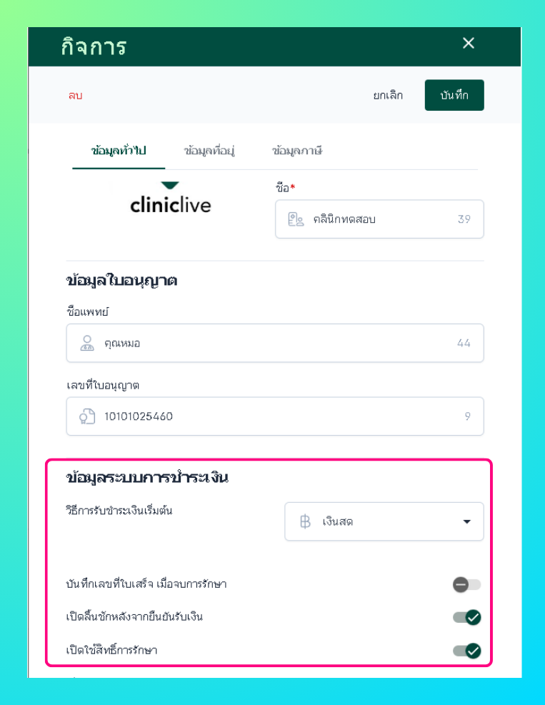ในการตั้งค่าข้อมูลกิจการ วัตถุประสงค์เพื่อบันทึกข้อมูลที่จำเป็นของกิจการโดยประกอบด้วย ข้อมูลคลินิก, ข้อมูลภาษีของคลินิก, ข้อมูลใบอนุญาต, ระบบการชำระเงิน, ข้อมูลกิจการ และขั้นตอนการยกเลิกใช้งาน