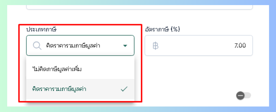 อัตราภาษี อัตราภาษีมูลค่าเพิ่ม จะแสดงเมื่อเลือกประเภทภาษีเป็น คิดราคารวมภาษีมูลค่า