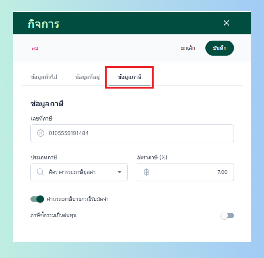 ในการตั้งค่าข้อมูลกิจการ วัตถุประสงค์เพื่อบันทึกข้อมูลที่จำเป็นของกิจการส่วนที่สาม การตั้งค่าข้อมูลภาษีส่วนนี้จะประกอบด้วย เลขที่ภาษี, ประเภทภาษี, อัตราภาษี %, การคำนวณภาษีกรณีรับมัดจำ, ภาษีซื้อรวมเป็นต้นทุน