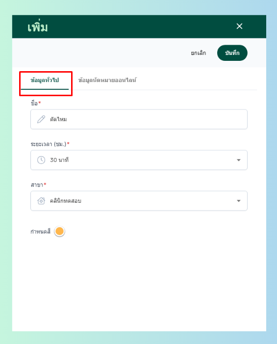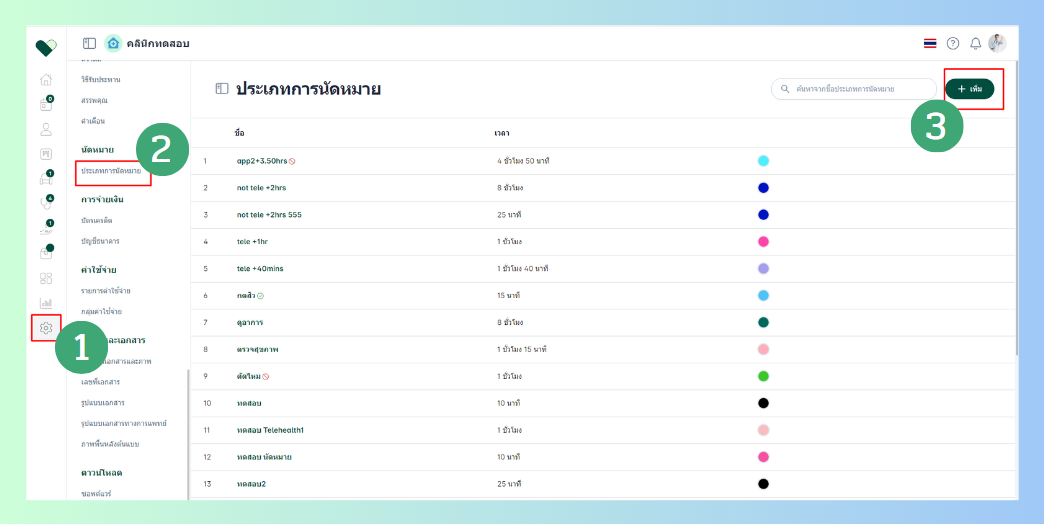 เมื่อผู้ใช้อยู่ในหน้าประเภทการนัดหมาย คลิกปุ่ม"เพิ่ม"