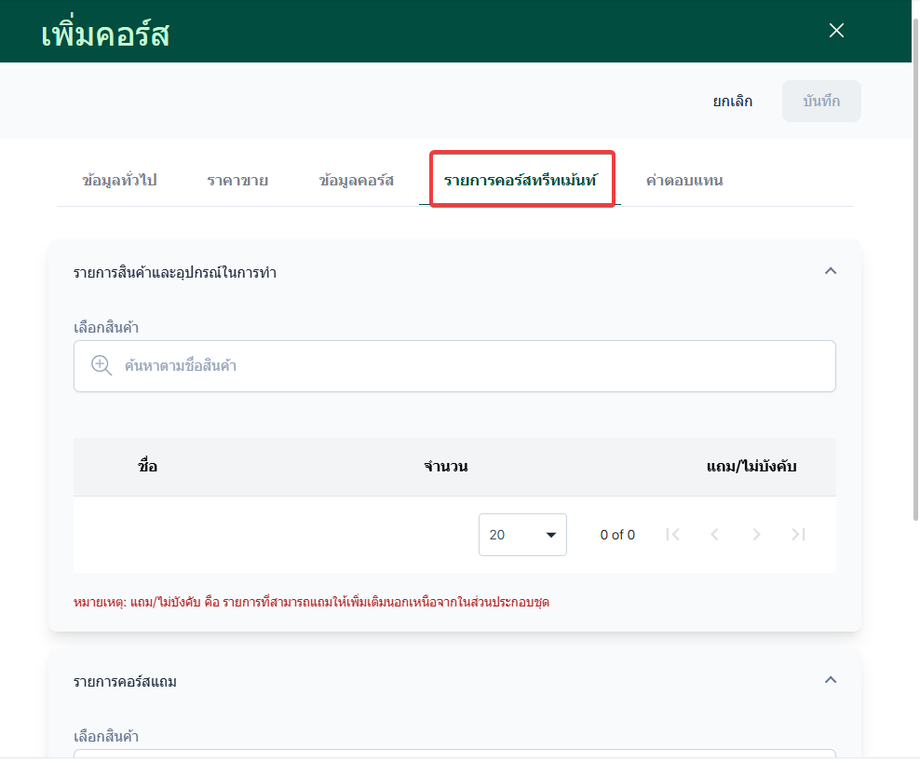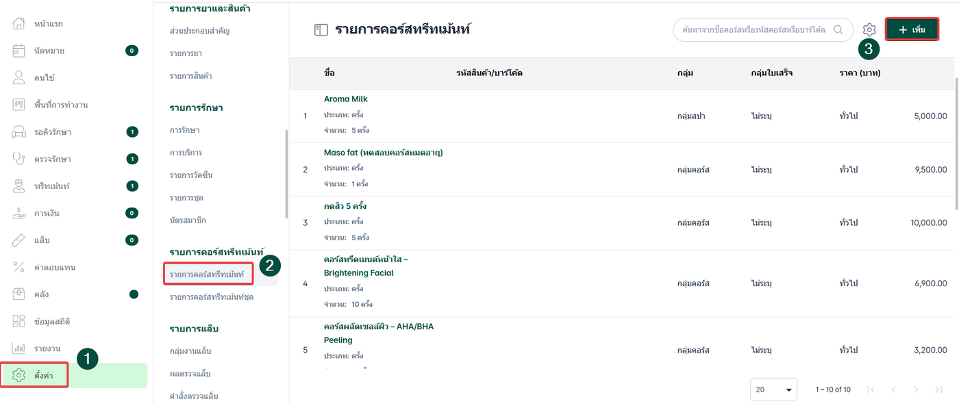 เลือกหัวข้อรายการคอร์สทรีทเม้นท์ เลือก รายการคอร์สทรีทเม้นท์