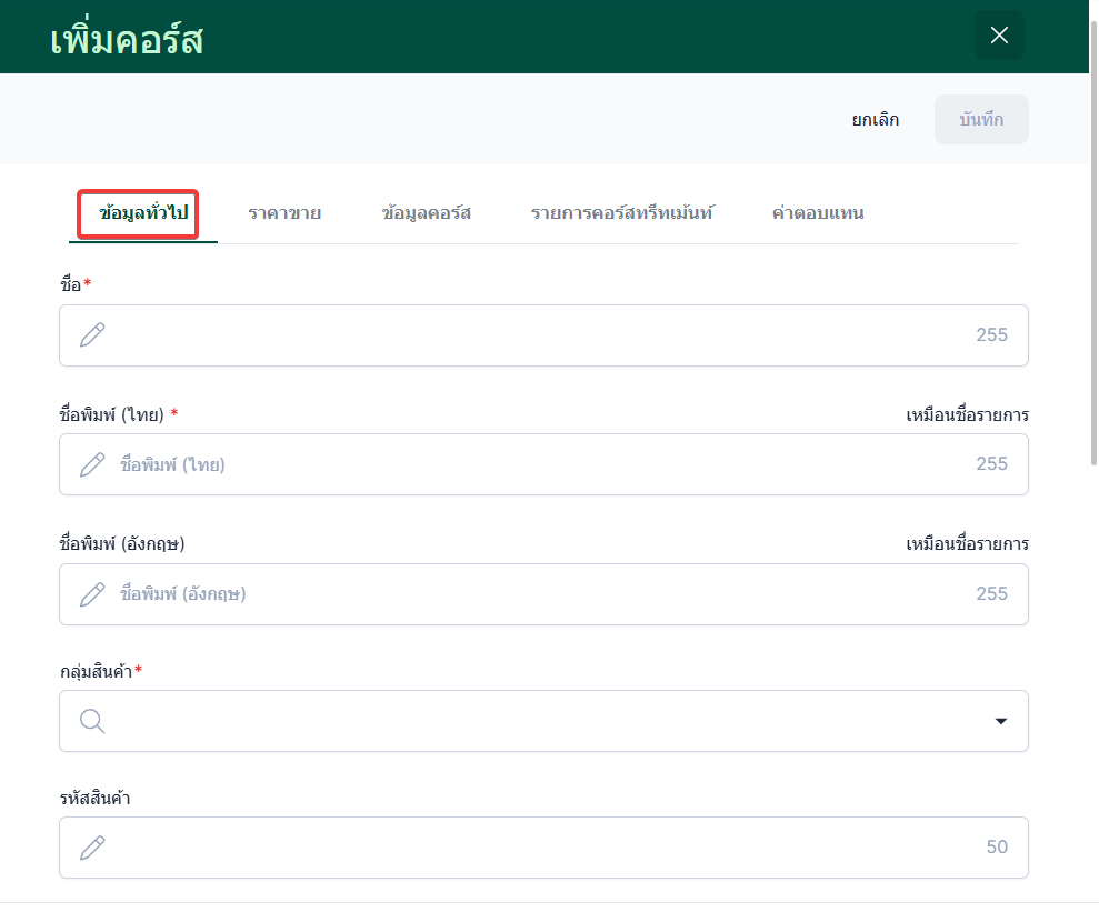 ผู้ใช้งานจะเข้าสู่หน้าเพิ่มรายการคอร์ส หน้าแสดงข้อมูลทั่วไป กรอกข้อมูลใหเรียบร้อย