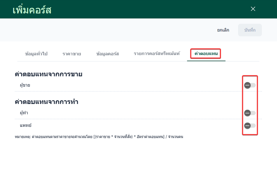การตั้งค่ารายการคอร์ส มีกระบวนการเพิ่มและแก้ไขรายการคอร์ส โดยมีหัวข้อหลักๆ ประกอบด้วยข้อมูลทั่วไป, ข้อมูลราคา, ข้อมูลคอร์ส, รายการคอร์ส, และค่าตอบแทนเพื่อระบุรายละเอียดของคอร์ส