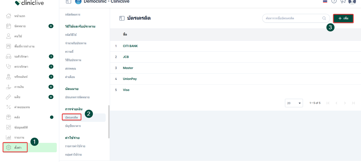 ขั้นตอนการตั้งค่าประเภทบัตรและธนาคาร เพื่อใช้เป็นช่องทางในการรับชำระเงินของคลินิก โดยคู่มือนี้จะแนะนำขั้นตอนการเพิ่ม แก้ไข และบันทึกข้อมูลรายละเอียดต่างๆ ของบัตรเครดิต ช่วยให้เจ้าหน้าที่การเงินสามารถทำรายการรับชำระเงินได้อย่างรวดเร็ว ถูกต้อง