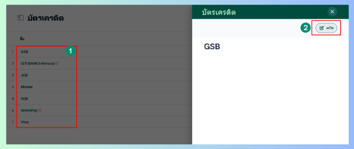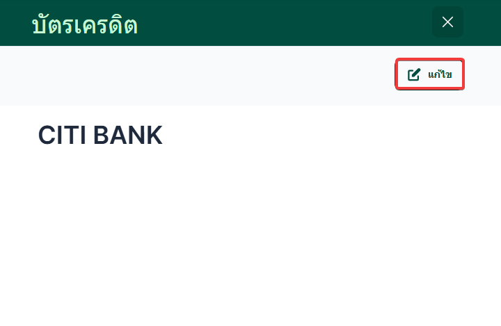 เมื่อผู้ใช้งานเข้าถึงหน้าบัตรเครดิต เลือกบัตรเครดิตที่ต้องการแก้ไข จะมีหน้าต่างแสดงข้อมูลบัตรเครดิตขึ้นมา กดแก้ไข