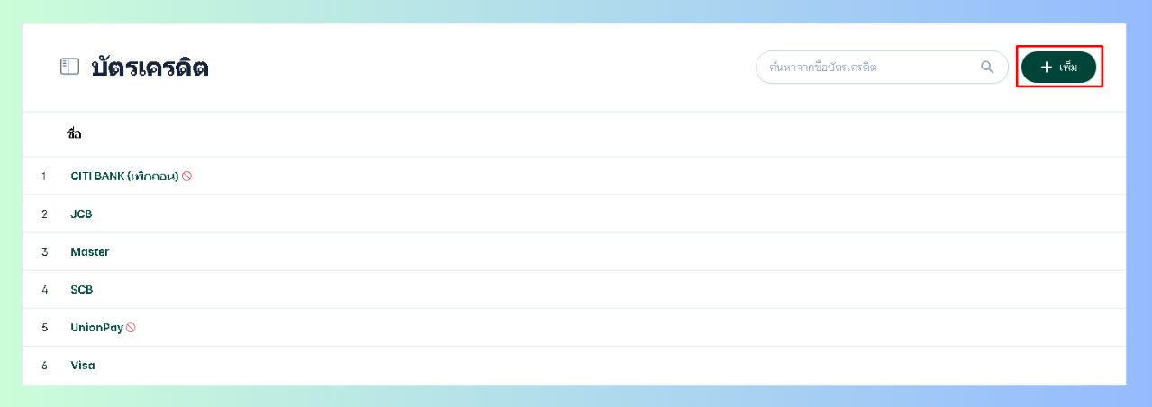 เมื่อผู้ใช้เข้าสู่หน้าบัตรเครดิตคลิกที่เพิ่ม