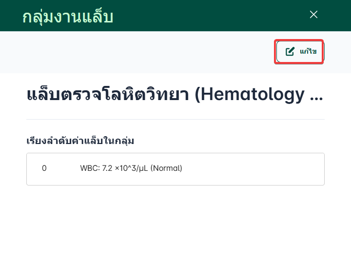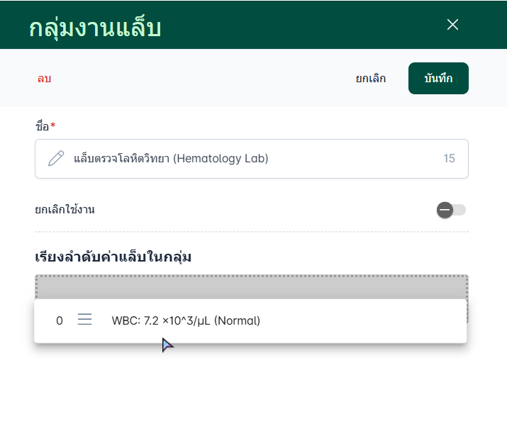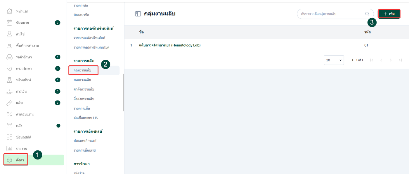 การตั้งค่ากลุ่มงานแล็บ โดยข้อมูลกลุ่มที่ตั้งค่าไว้จะแสดงเป็นตัวเลือกสำคัญในขั้นตอนการเพิ่มชนิดแล็บ เพื่อระบุว่าการตรวจนั้นๆ สังกัดอยู่ในกลุ่มใด ช่วยให้เจ้าหน้าที่ค้นหารายการแล็บได้รวดเร็ว และสะดวกต่อการแยกประเภทรายงานผลการตรวจให้ชัดเจน
