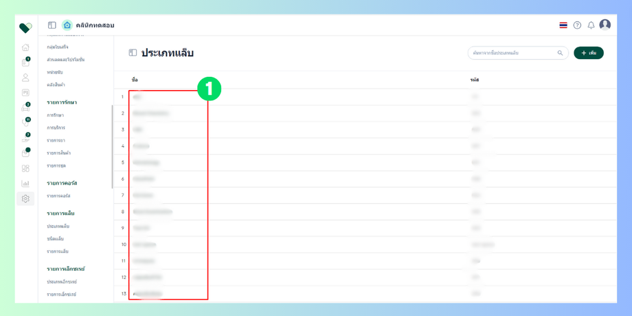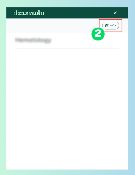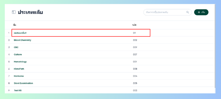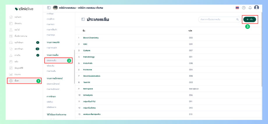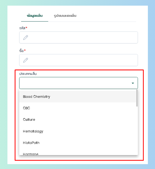 การตั้งค่าประเภทแล็บ จะมีการใช้งานนี้จะอยู่ในขั้นตอนการเพิ่มชนิดแล็บ โดยมีขั้นตอนดังนี้