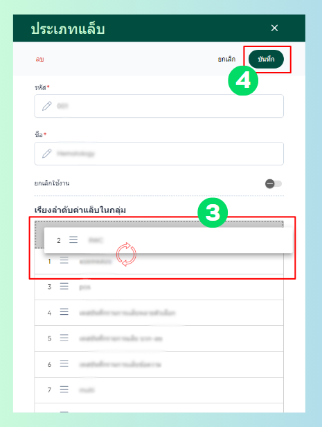 ผู้ใช้สามารถจัดเรียงลำดับค่าแล็บในประเภทแล็บได้ และผลแล็บจะเรียงตามลำดับเมื่อสั่งพิมพ์ใบผลแล็บออกมา