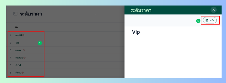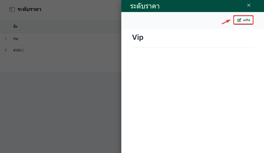 เมื่อผู้ใช้อยู่ในหน้าระดับราคา เลือกระดับราคาที่ต้องการแก้ไขจะมีหน้าต่างแสดงข้อมูลขึ้นมาเลือกที่ขวาบน "แก้ไข"