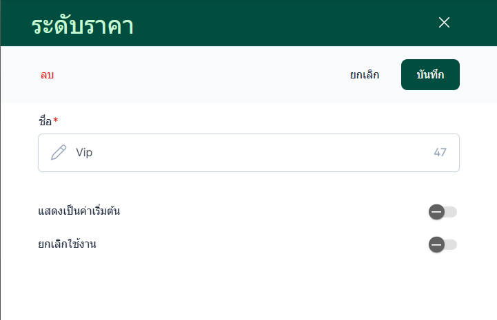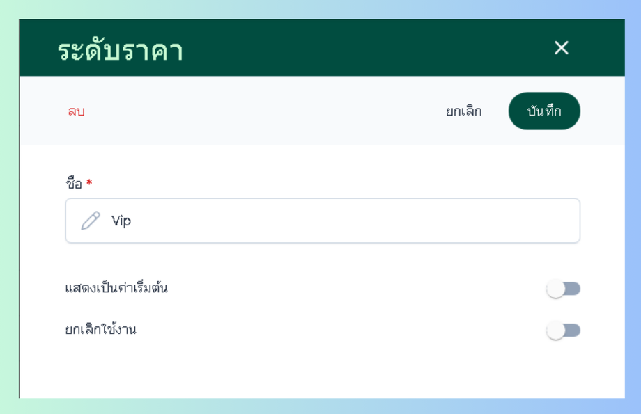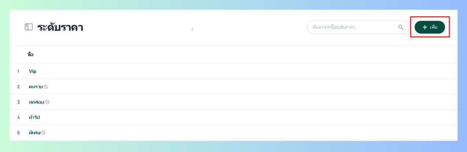 ผู้ใช้งานจะสามารถตั้งราคาสินค้าหรือบริการตามระดับราคาที่ทำการตั้งค่าไว้ได้ใน การจัดการสินค้าและบริการ