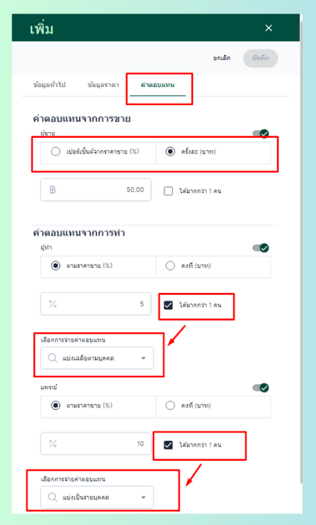 - ระบุค่าตอบแทน เลือกให้ค่าตอบแทนเป็นเปอร์เซ็นต์ หรือครั้งละกี่บาท ระบุจำนวนเปอร์เซ็นต์หรือระบุจำนวนเงิน และสามารถให้ค่าตอบแทนได้มากกว่า 1 คน หากเลือกให้ได้มากกว่า 1 คน ต้องเลือกว่าจะจ่ายค่าตอบแทนเป็นแบบแบ่งเฉลี่ยตามบุคคล หรือแบ่งเป็นรายบุคคล