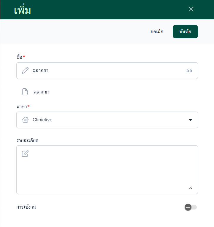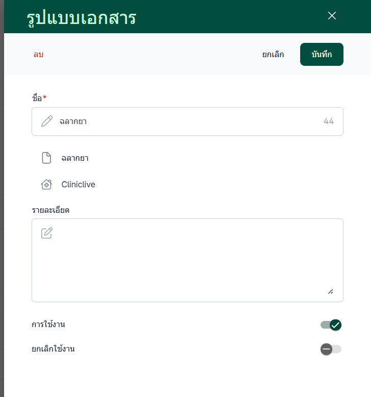 การใช้งาน : เปิด/ปิด การใช้งานถ้าผู้ใช้ไม่เปิดการใช้งานให้เป็นสีเขียวจะไม่มาสามารถพิมพ์เอกสารนั้นได้