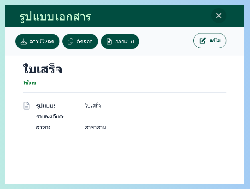 - เมื่อคลิกที่เอกสารแล้ว จะสามารถดาวน์โหลดเอกสาร คัดลอกเอกสาร ออกแบบเอกสาร และแก้ไข