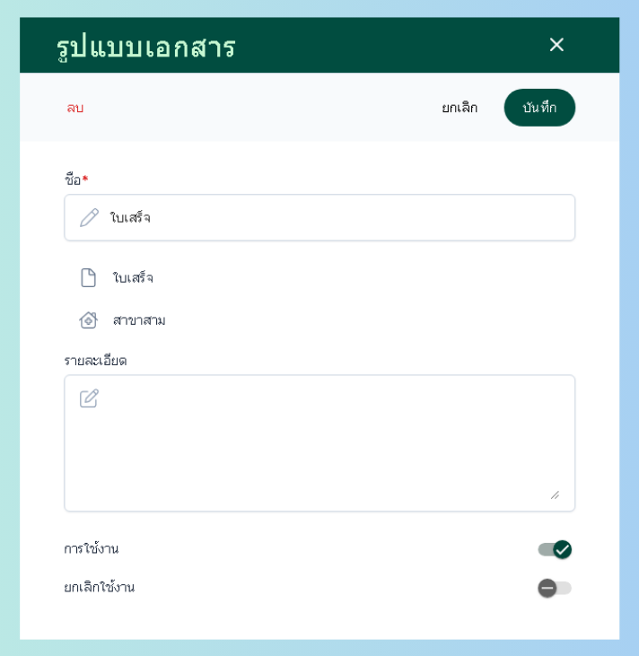 - ยกเลิกใช้งาน : ถ้าผู้ใช้งานยกเลิกการใช้งานจะไม่สามารถใช้งานเอกสารได้
