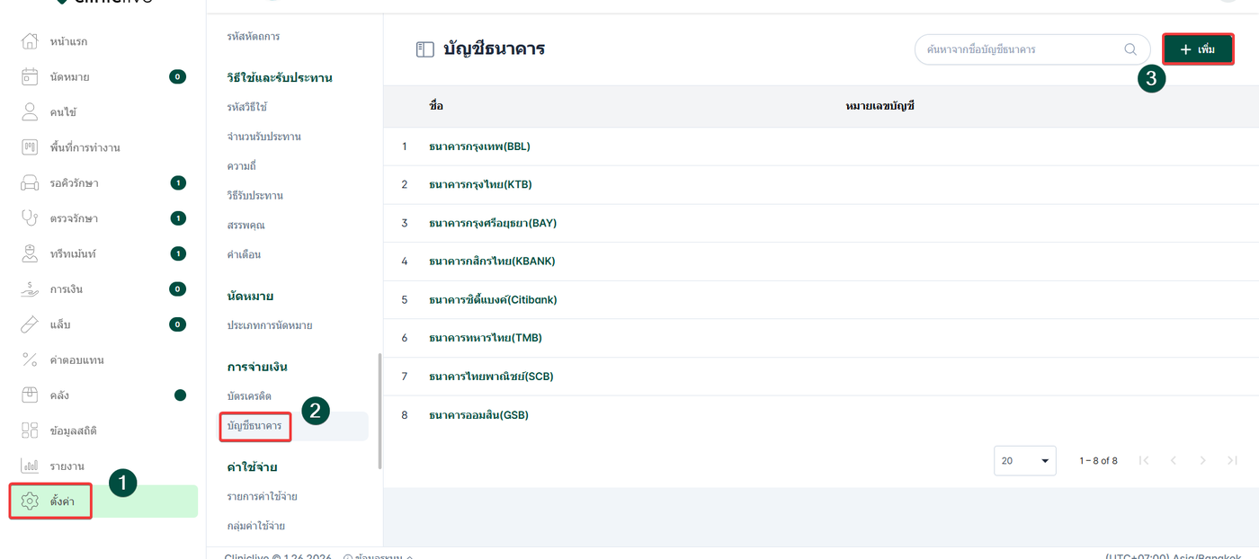 ขั้นตอนการบันทึกฐานข้อมูลเลขที่บัญชีและสาขาของคลินิก เพื่อใช้ในการรับชำระเงินและการโอนเงินในระบบ โดยคู่มือนี้จะแนะนำวิธีการเพิ่มหรือแก้ไขข้อมูลบัญชีธนาคารอย่างละเอียด เพื่อให้ข้อมูลทางการเงินมีความถูกต้อง