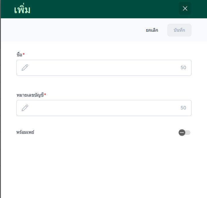 ระบบจะแสดงหน้าต่างเพิ่มบัญชีธนาคารขึ้นมา กรุณากรอกข้อมูลบัญชีธนาคาร