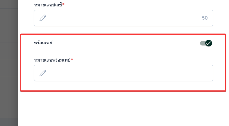 พร้อมเพย์ เมื่อคลิกรายการพร้อมเพย์ระบบจะเเสดงช่อง สามารถกรอกเลขพร้อมเพย์ได้