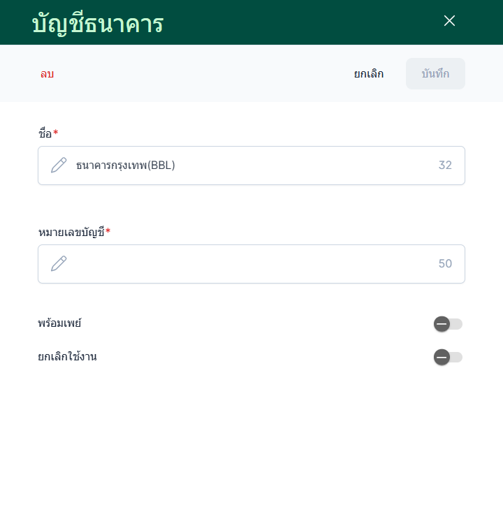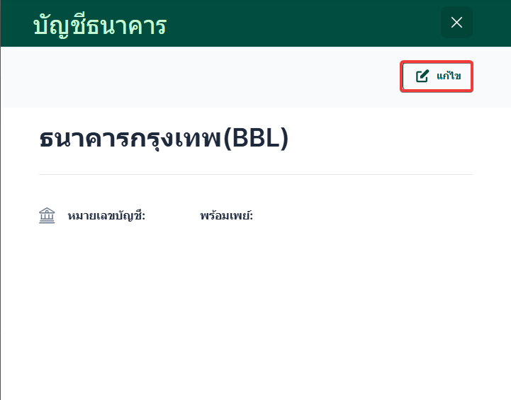 เมื่อผู้ใช้งานเข้าถึงหน้าบัญชีธนาคาร เลือกบัญชีธนาคารที่ต้องการแก้ไข จะมีหน้าต่างแสดงข้อมูลบัญชีธนาคารขึ้นมา กดแก้ไข