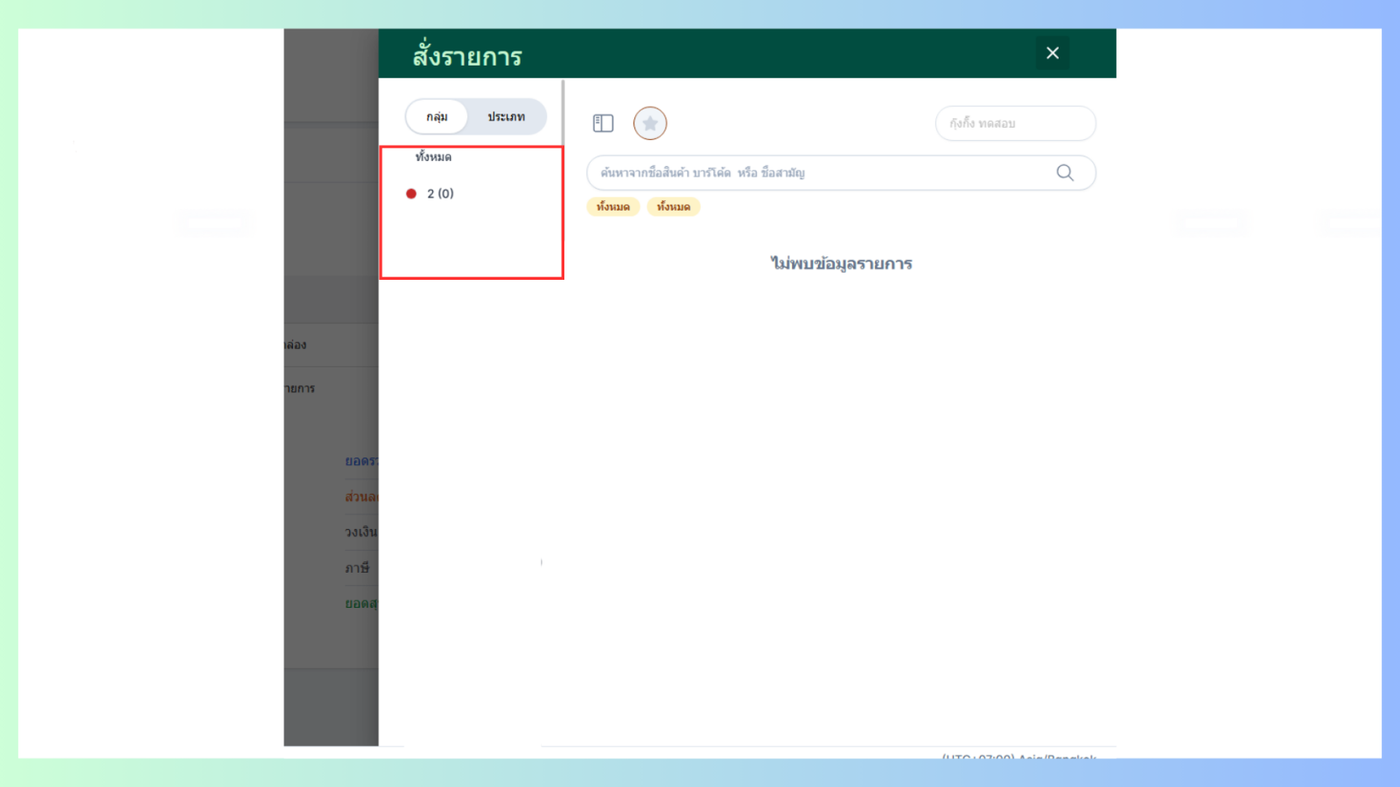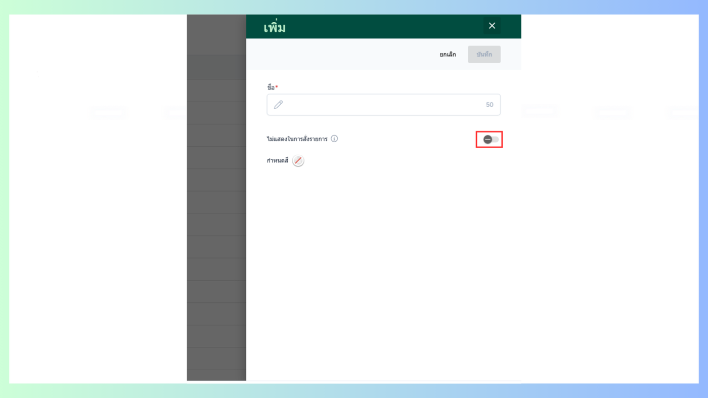 ไม่แสดงในการสั่งรายการ คือรายการสินค้าที่อยู่ในกลุ่มนี้จะไม่แสดงในหน้าสั่งรายการ
