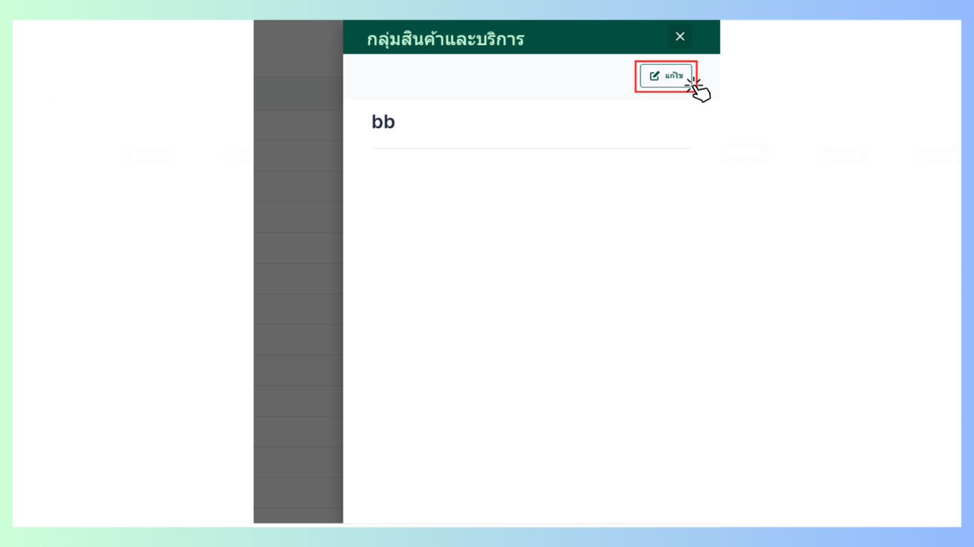 เมื่อผู้ใช้อยู่ในหน้ากลุ่มสินค้าและบริการ เลือกกลุ่มสินค้าและบริการที่ต้องการแก้ไขจะมีหน้าต่างแสดงข้อมูลขึ้นมา > แก้ไข