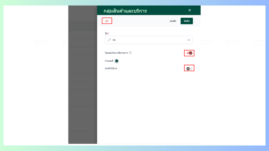 การยกเลิก: รายการจะยังอยู่ในระบบแต่แสดงสถานะ ยกเลิก