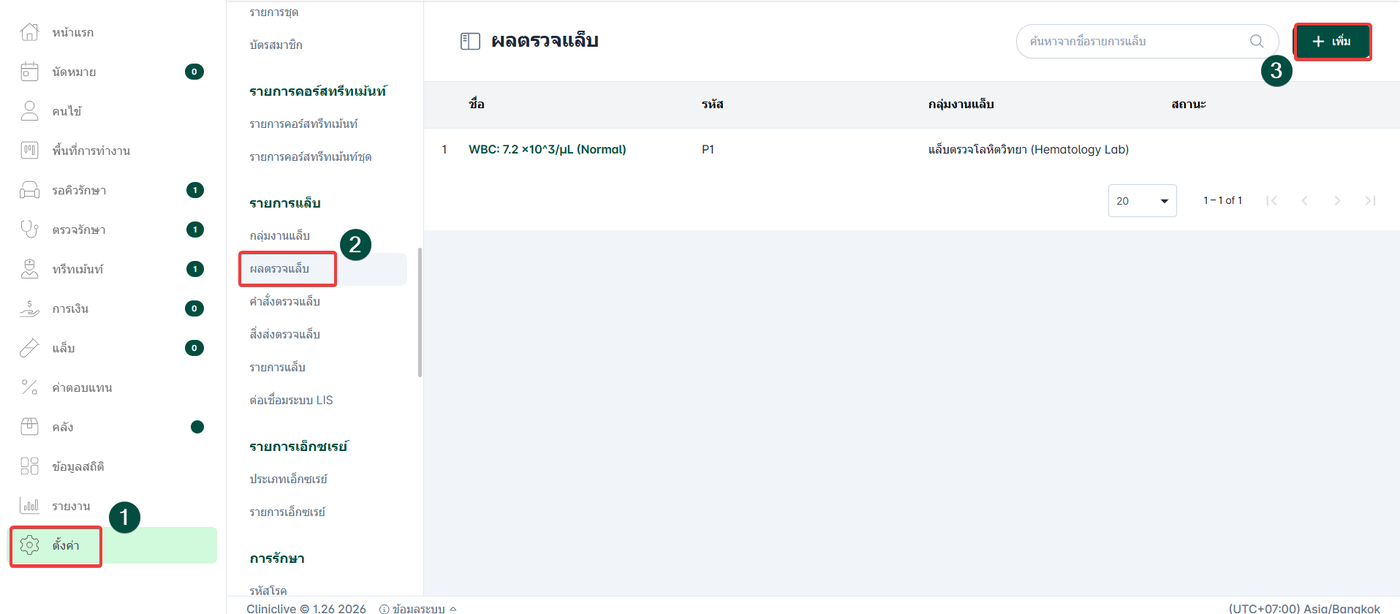 การกำหนดรายละเอียดรายการตรวจวิเคราะห์เพื่อนำไปใช้งานจริงในห้องตรวจรักษา โดยข้อมูลที่ตั้งค่าไว้จะปรากฏในส่วนรายการแล็บ เพื่อให้แพทย์หรือเจ้าหน้าที่สามารถสั่งตรวจและบันทึกผลการแล็บได้อย่างถูกต้อง ช่วยให้การวินิจฉัยและการรายงานผลตรวจมีความแม่นยำและเป็นระบบ