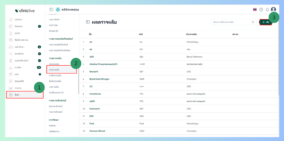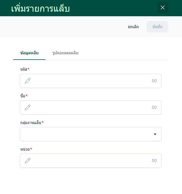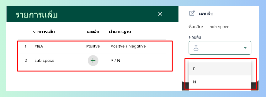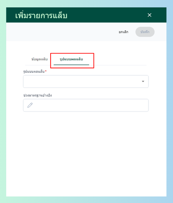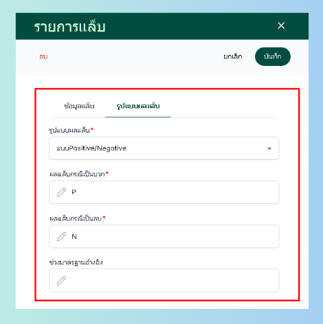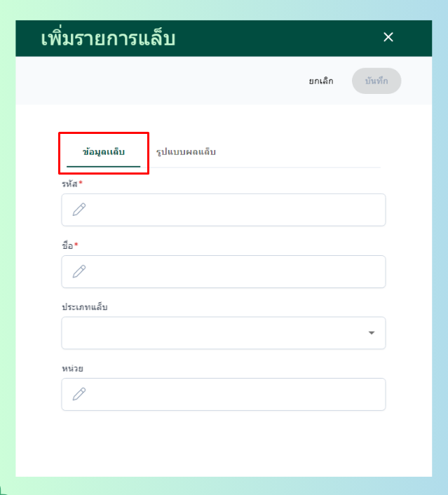 ผู้ใช้งานจะเข้าสู่หน้าเพิ่มข้อมูลเเล็บและหน้าเพิ่มรูปแบบผลแล็บ