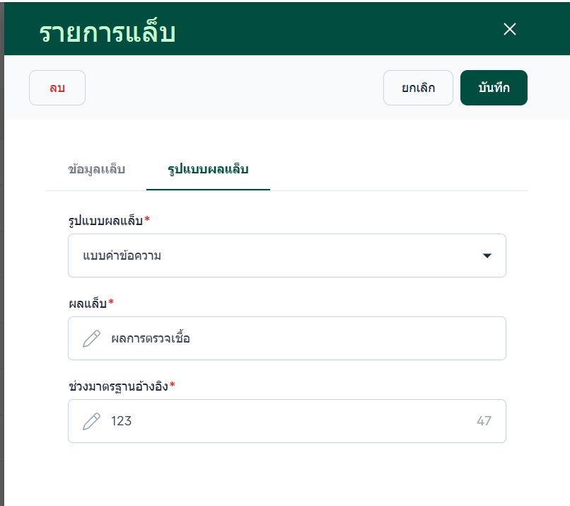รูปแบบผลแล็บ เช่น แบบค่าข้อความ , ค่าตัวเลข เป็นต้น