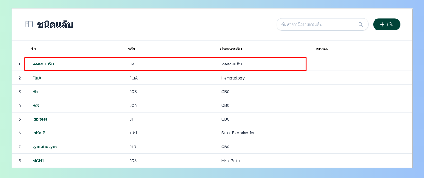 เลือกเมนูรายการแล็บ>ชนิดแล็บ