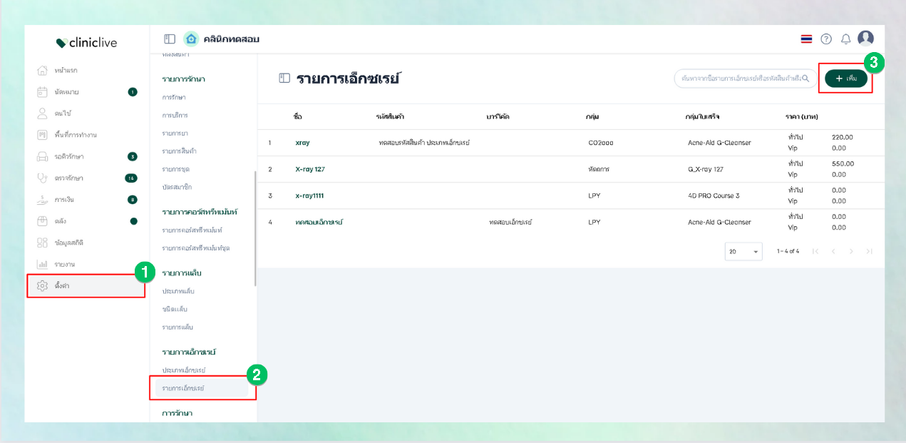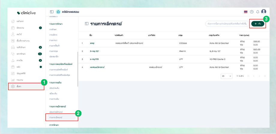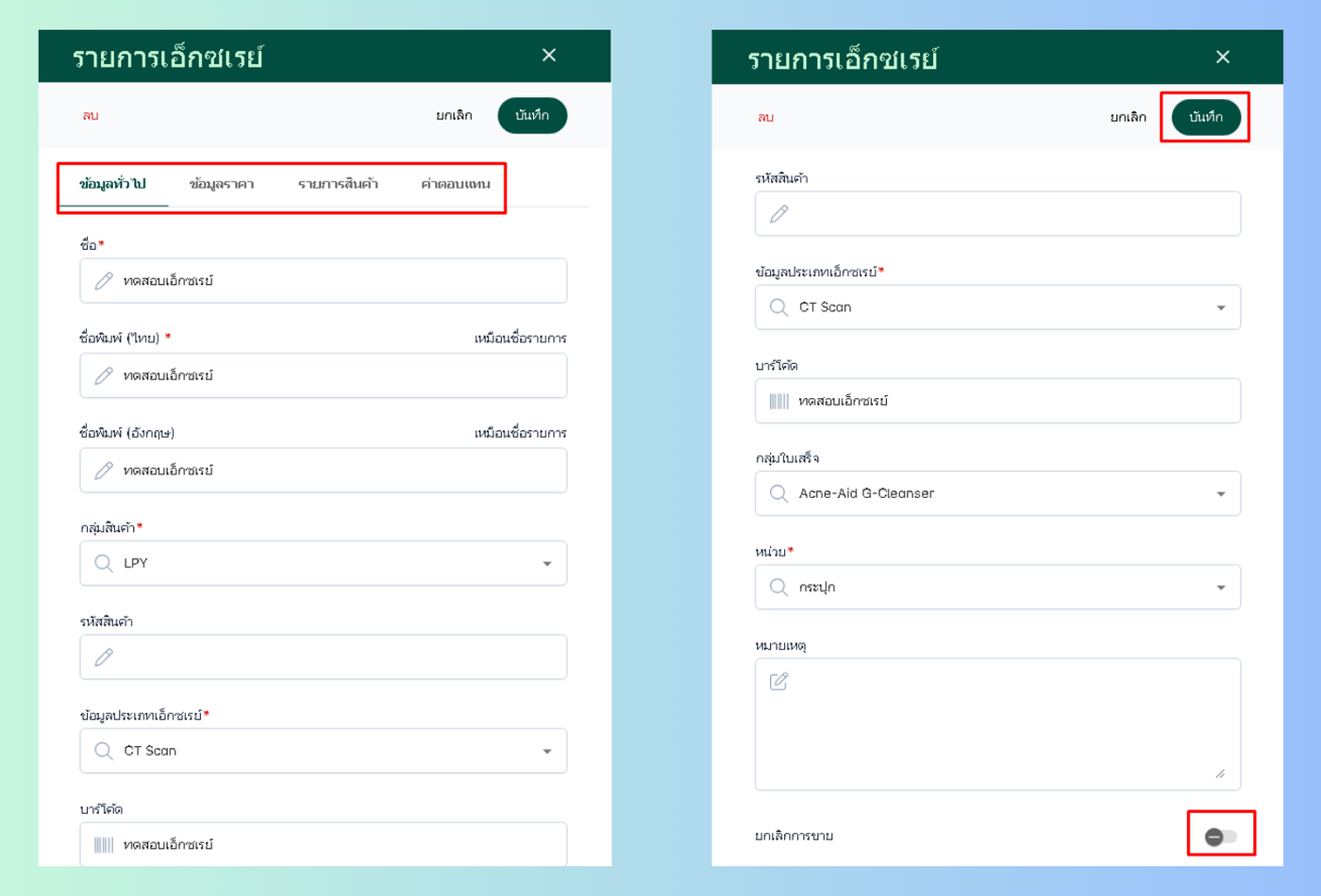 การตั้งค่ารายการเอ็กซเรย์ คือบันทึกข้อมูลรายการเอ็กซเรย์ เช่น ข้อมูลทั่วไป ข้อมูลราคา รายการสินค้า ค่าตอบแทน จะถูกใช้งานในส่วนหลักของขั้นตอนการสั่งรายการ