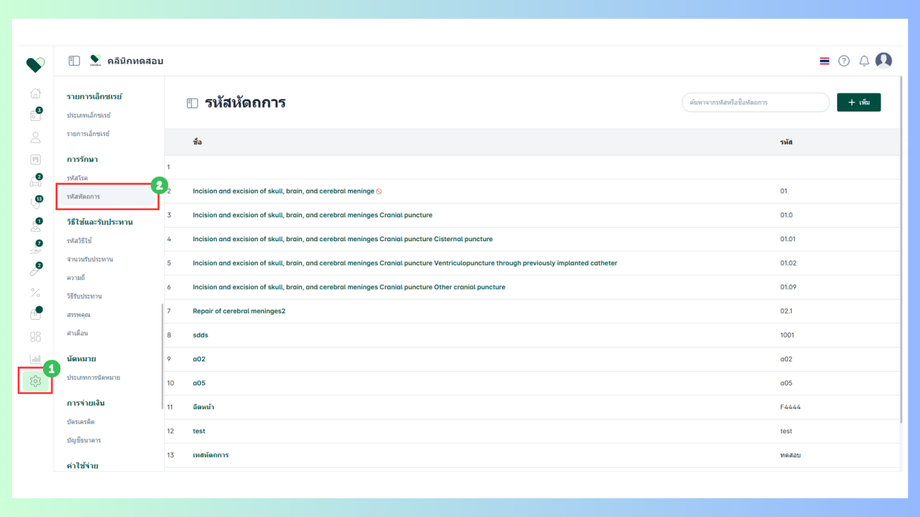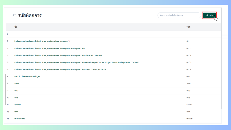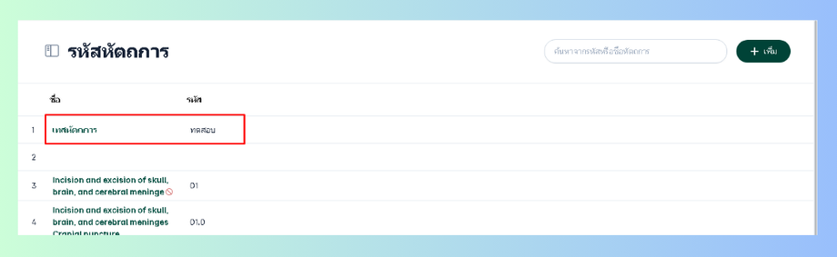 เลือกเมนูรายการรักษา > รหัสหัตถการ