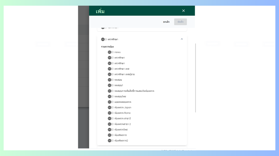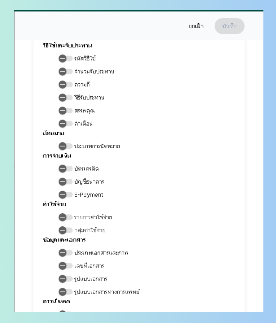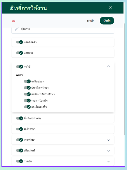 ตรวจรักษา เป็นการกำหนดสิทธิ์ให้ผู้ใช้งานสามารถใช้งานหน้าตรวจรักษาได้