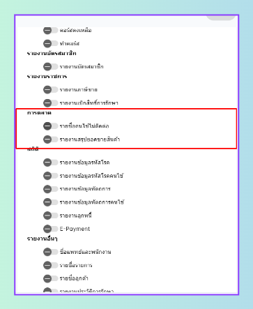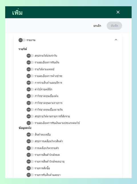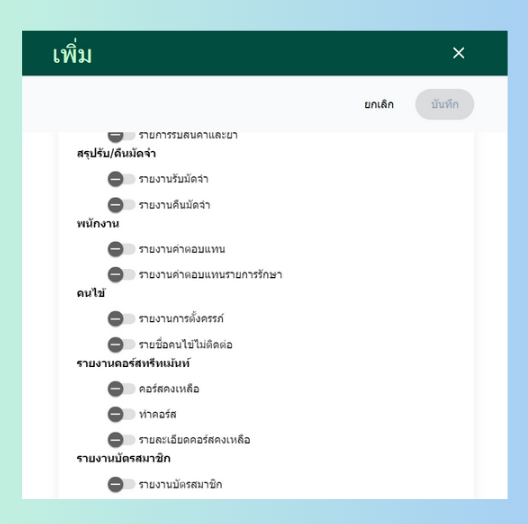 รายงาน เป็นการกำหนดสิทธิ์ให้ผู้ใช้งานสามารถใช้งานหน้ารายงานได้