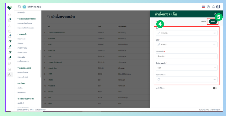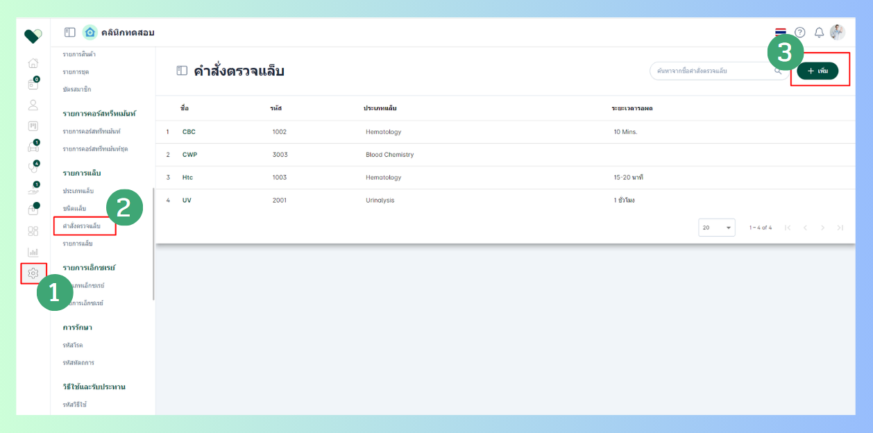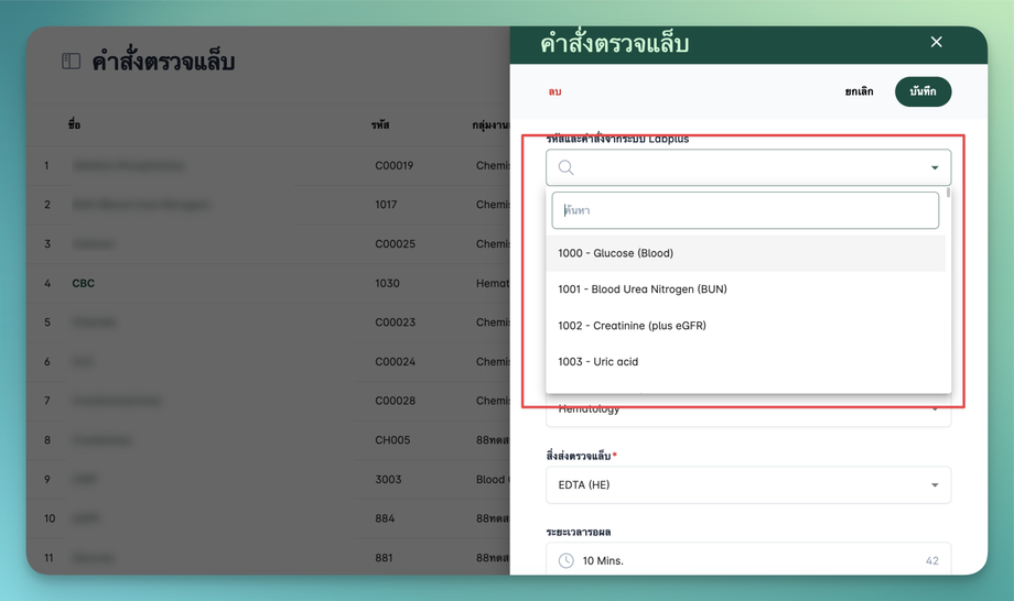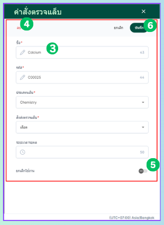 - ระบุข้อมูลต่างๆโดยระบุชื่อ รหัส ประเภทแล็บ และระยะเวลารอผล