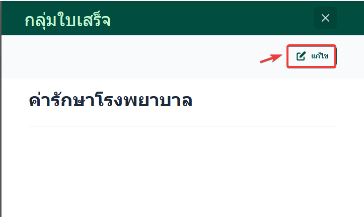 เมื่อผู้ใช้อยู่ในหน้ากลุ่มใบเสร็จ เลือกกลุ่มใบเสร็จที่ต้องการแก้ไขจะมีหน้าต่างแสดงข้อมูลขึ้นมา