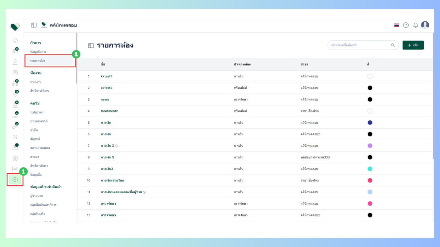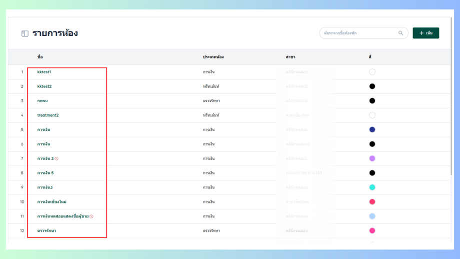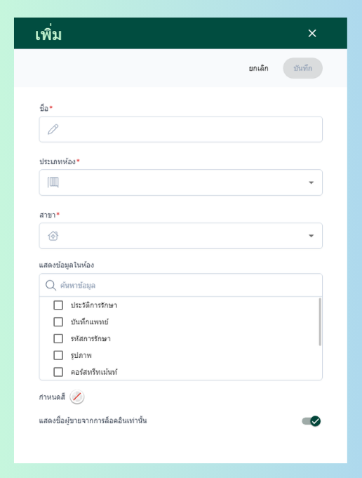 ประเภทห้อง : เลือกประเภทห้องจะให้อยู่ในรูปแบบไหน เช่น ตรวจรักษา การเงิน