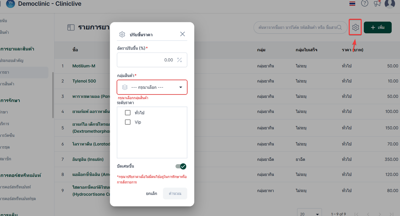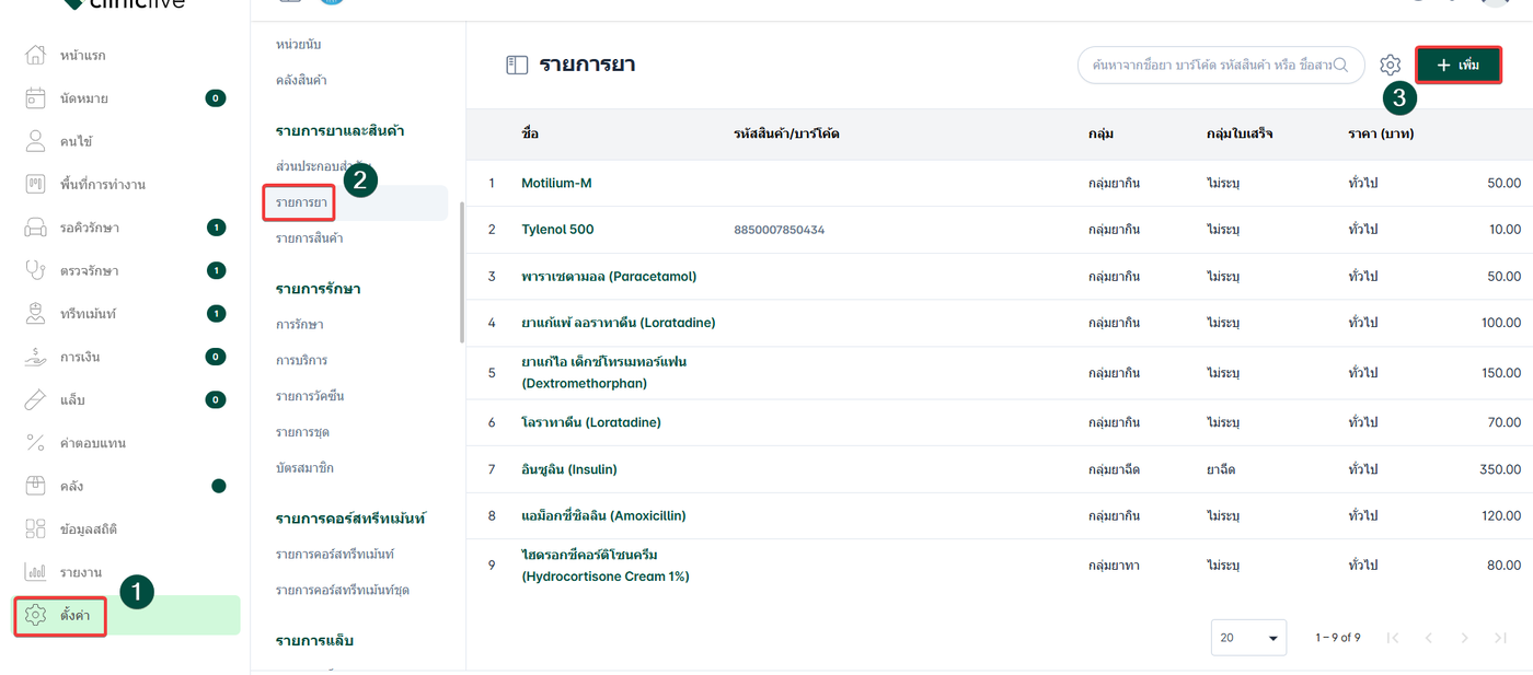 เลือกหัวข้อรายการยาและสินค้า จากนั้นเลือกรายการยา