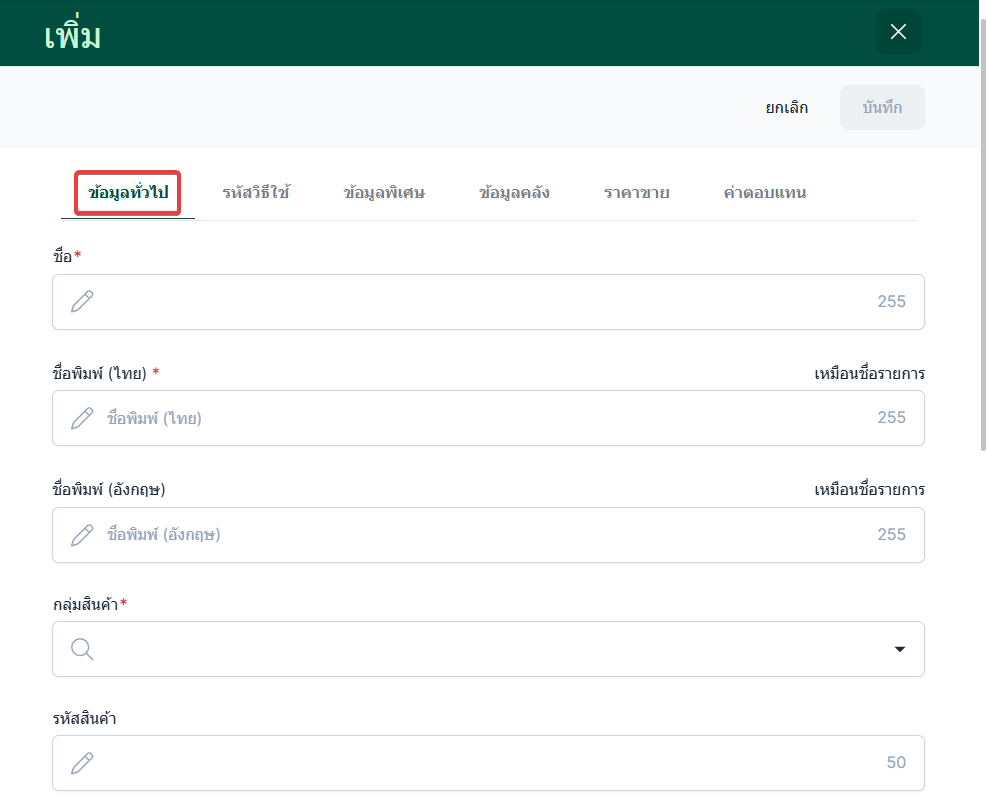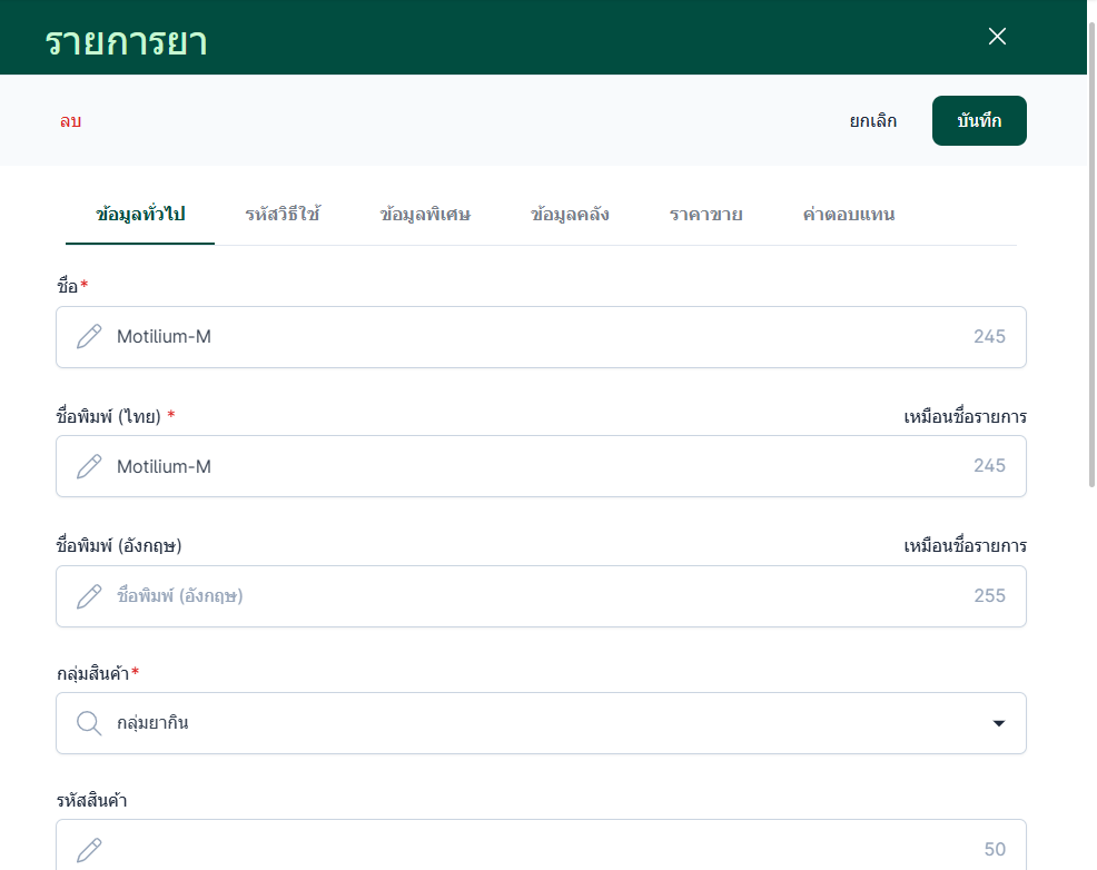 ข้อมูลทั่วไป จะมีหน้าต่างแสดงขึ้นมาให้กรอกข้อมูล ชื่อ กลุ่มสินค้า รหัสสินค้า ชื่อสามัญ บาร์โค้ด กลุ่มใบเสร็จ รหัสวิธีใช้ หมายเหตุ