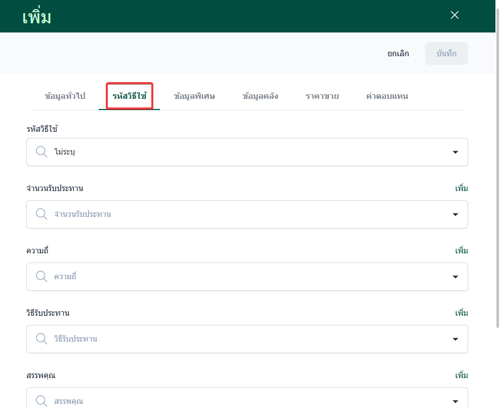 รหัสวิธีใช้ สามารถเพิ่มข้อมูลได้จากหน้านี้ได้เลยไม่จำเป็นต้องไปเพิ่มที่หน้าตั้งค่า "จำนวนรับประทาน ความถี่ วิธีรับประทาน สรรพคุณ คำเตือน"