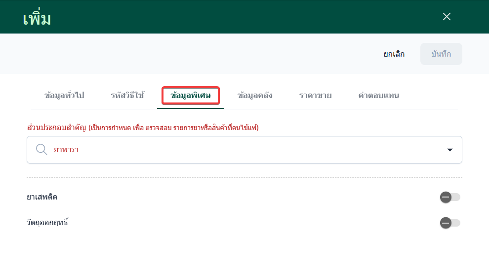 ข้อมูลพิเศษ เลือกส่วนประกอบสำคัญ (เป็นการกำหนด เพื่อ ตรวจสอบ รายการยาหรือสินค้าที่คนไข้แพ้)