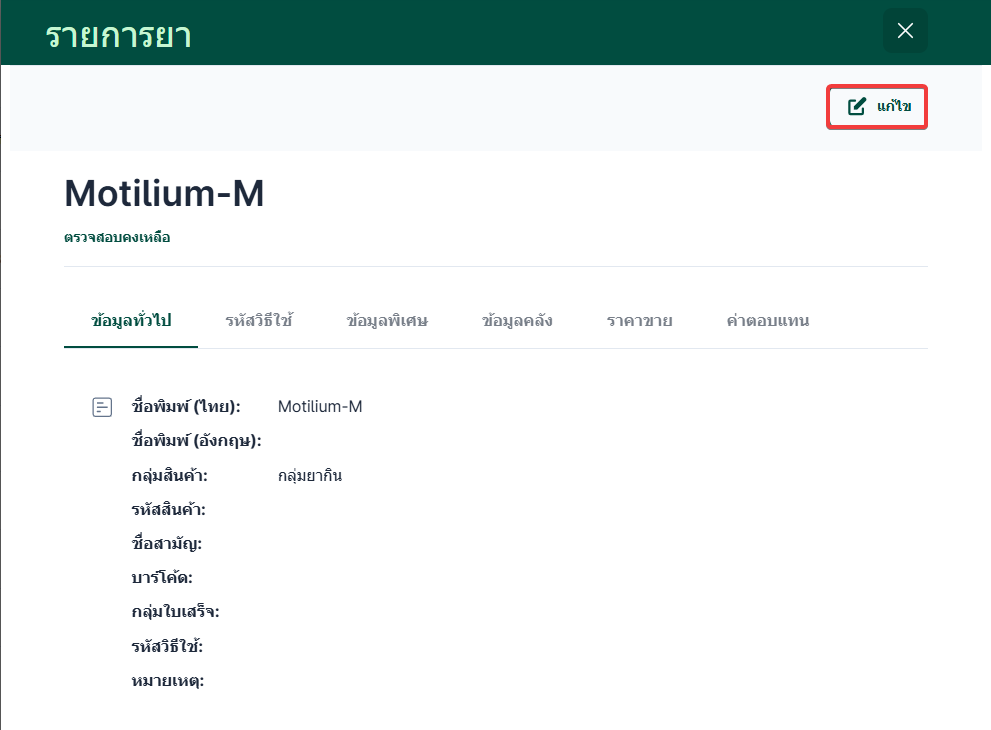 เมื่อผู้ใช้อยู่ในหน้ารายการยาคลิก เลือกรายการยาที่ต้องการแก้ไข