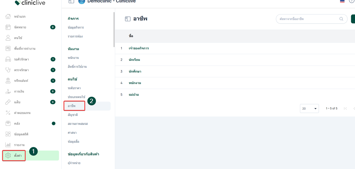 การตั้งค่าข้อมูลอาชีพจะแสดงเมื่อมีการเลือกอาชีพในขั้นตอนการเพิ่มและแก้ไขคนไข้ เพิ่มทำการเก็บข้อมูลทางการตลาด