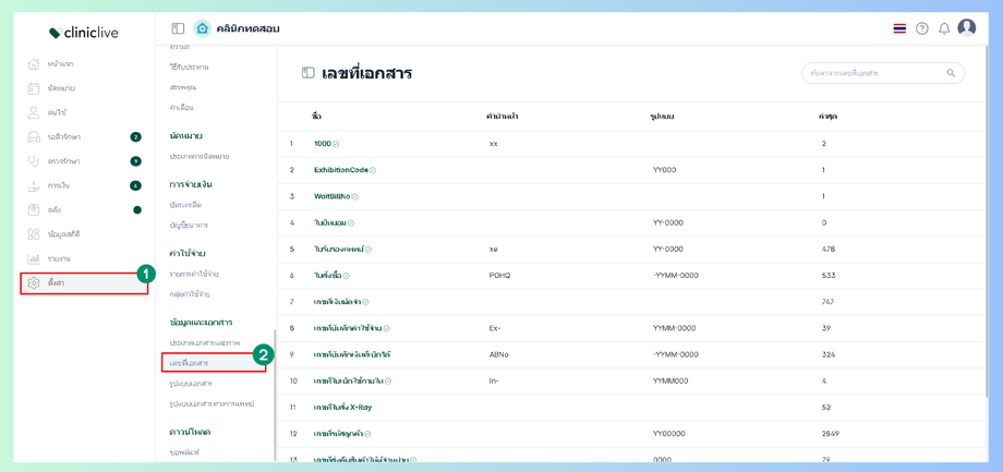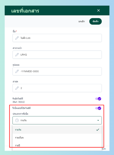 เลขที่เอกสารที่สามารถทำการรีเซ็ตได้ ได้แก่ รายการแล็บ ใบเสร็จรับเงิน และรหัสลูกค้า สามารถรีเซ็ตเลขที่เอกสารได้โดยการกดเปิดด้านขวา และเลือกประเภทการรีเซ็ต ว่าต้องการให้รีเซ็ตทุกวัน ทุกเดือน หรือทุกปี