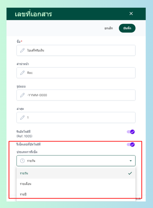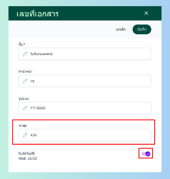 จะมีระบบให้รันอัตโนมัติ สามาแก้ไขการรันเลขได้ที่ช่องล่าสุด โดยกำหนดเลขแล้วหลังจากนั้นเมื่อใช้เอกสารนี้เลขจะรันเพิ่มขึ้นไปเรื่อยๆ