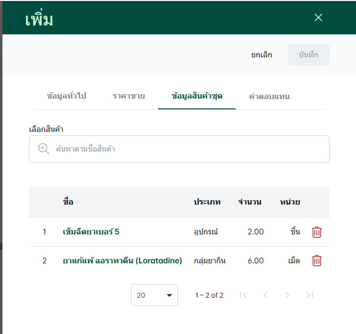 การรวมรายการสินค้า ยา หรือบริการหลายรายการเข้าด้วยกันเพื่อจำหน่ายเป็นรายการเดียว โดยระบบจะช่วยให้คุณสามารถจัดการการขายและการตัดสต็อกสินค้าหลายชนิดพร้อมกันได้ในคลิกเดียว ช่วยเพิ่มความสะดวกในการออกใบเสร็จและสร้างข้อเสนอที่คุ้มค่าให้กับลูกค้าได้อย่างรวดเร็ว