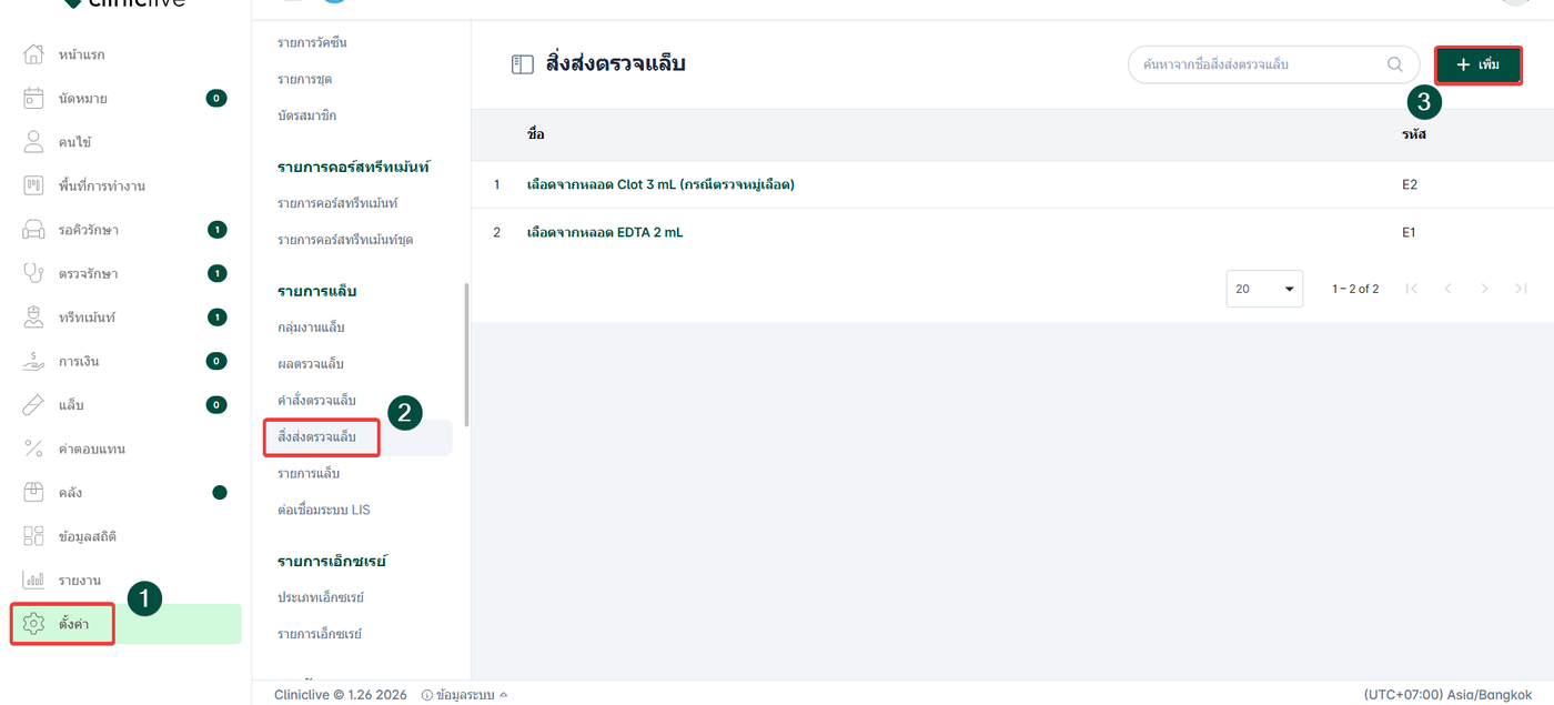 เมื่อคลิกเพิ่ม ระบบจะแสดงหน้าเพิ่มข้อมูลสิ่งส่งตรวจแล็บขึ้นมา