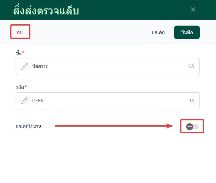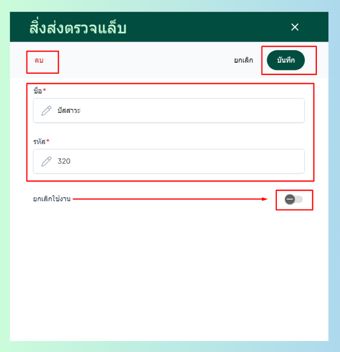 จากนั้นเลือกได้ว่าจะแก้ไข้ข้อมูล ยกเลิกการใช้งาน หรือต้องการลบสิ่งส่งตรวจ