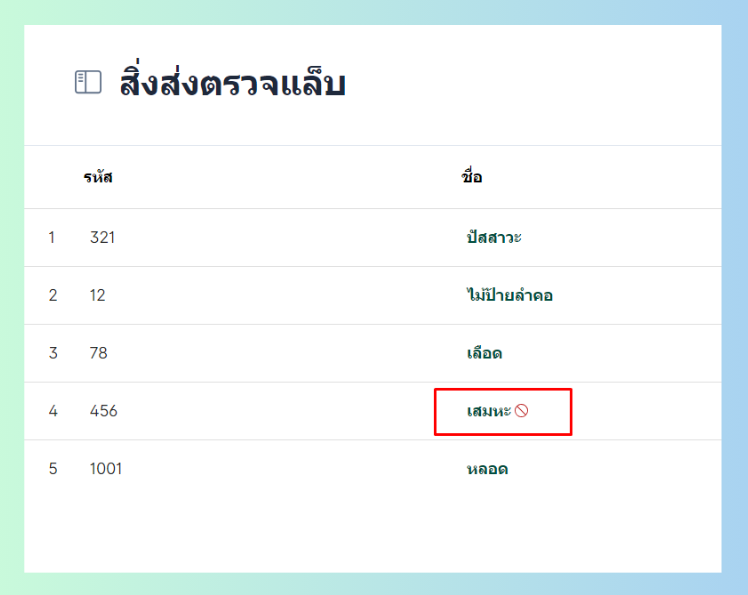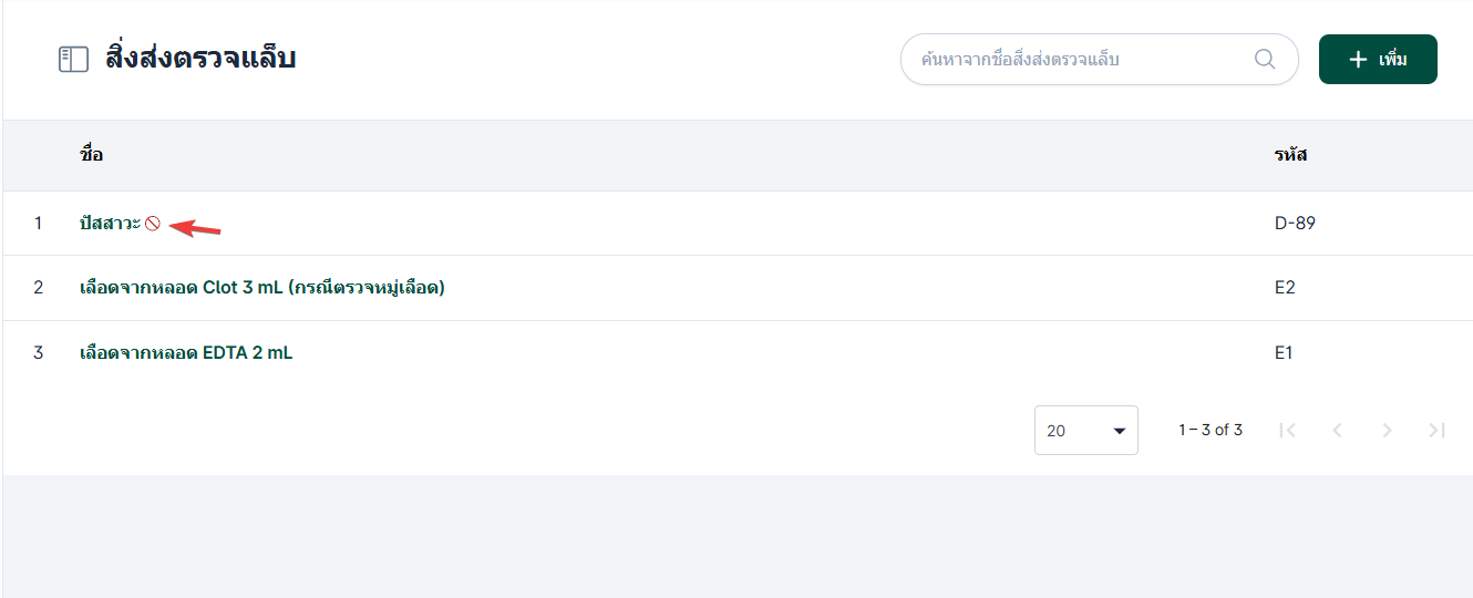 โดยสามารถดูรายละเอียดข้อมูลสิ่งส่งตรวจ แก้ไข้ข้อมูล ยกเลิกการใช้งาน และสามารถลบสิ่งส่งตรวจได้ด้วยวิธีนี้
